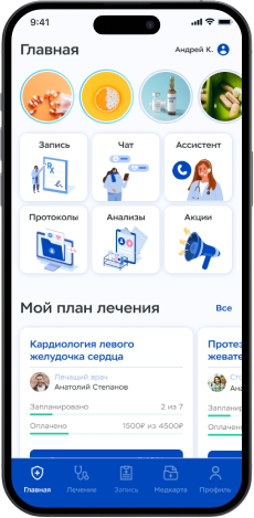 Во вкладке «Лечение» – ваш персональный паспорт здоровья. Ваш план лечения и историю обследований и назначений врача вы можете найти в приложении во вкладке «Главная» в блоке «Мой план лечения». Чтобы развернуть информацию на экран, нажмите «Все» около названия блока. Во вкладке «Медкарта» вы найдете файлы с результатами обследований, протоколы приемов, план лечения. Во вкладке «Профиль» история оплат услуг.